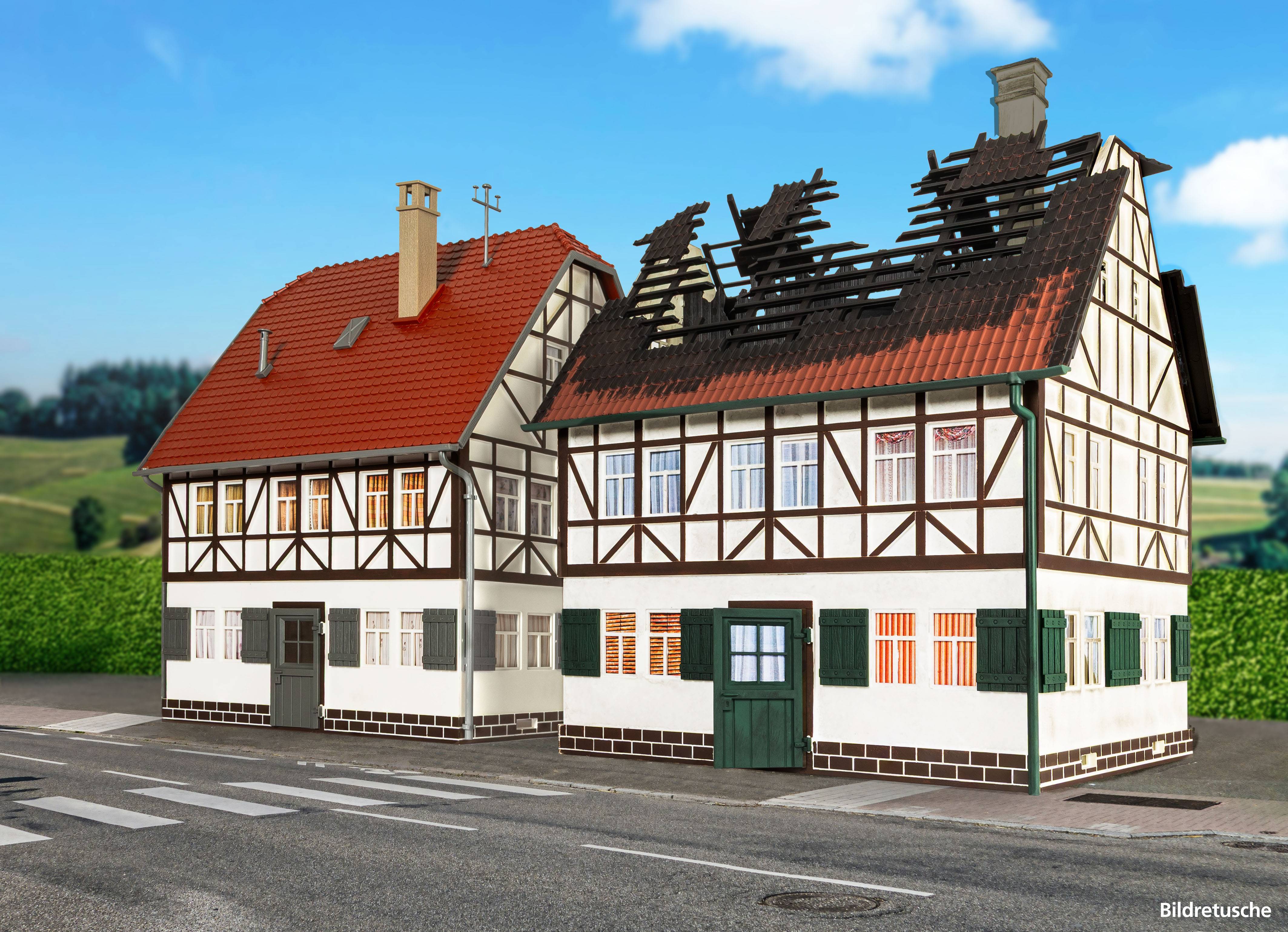 Verwittertes Fachwerkhaus mit realistischen Brandspuren | Türen öffnen sich für mehr Realismus | Eindrucksvolles Gebäudemodell für die Gartenbahnanlage