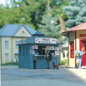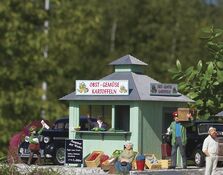 Auf dem wöchentlichen Markt gibt es eine Reihe kleiner stationärer Verkaufsstände, bei denen man alle möglichen Lebensmittel kaufen kann. Die feinste Leberkäs-Semmel hat Gustl. (Figuren und Wurstimitationen liegen dem Bausatz nicht bei)