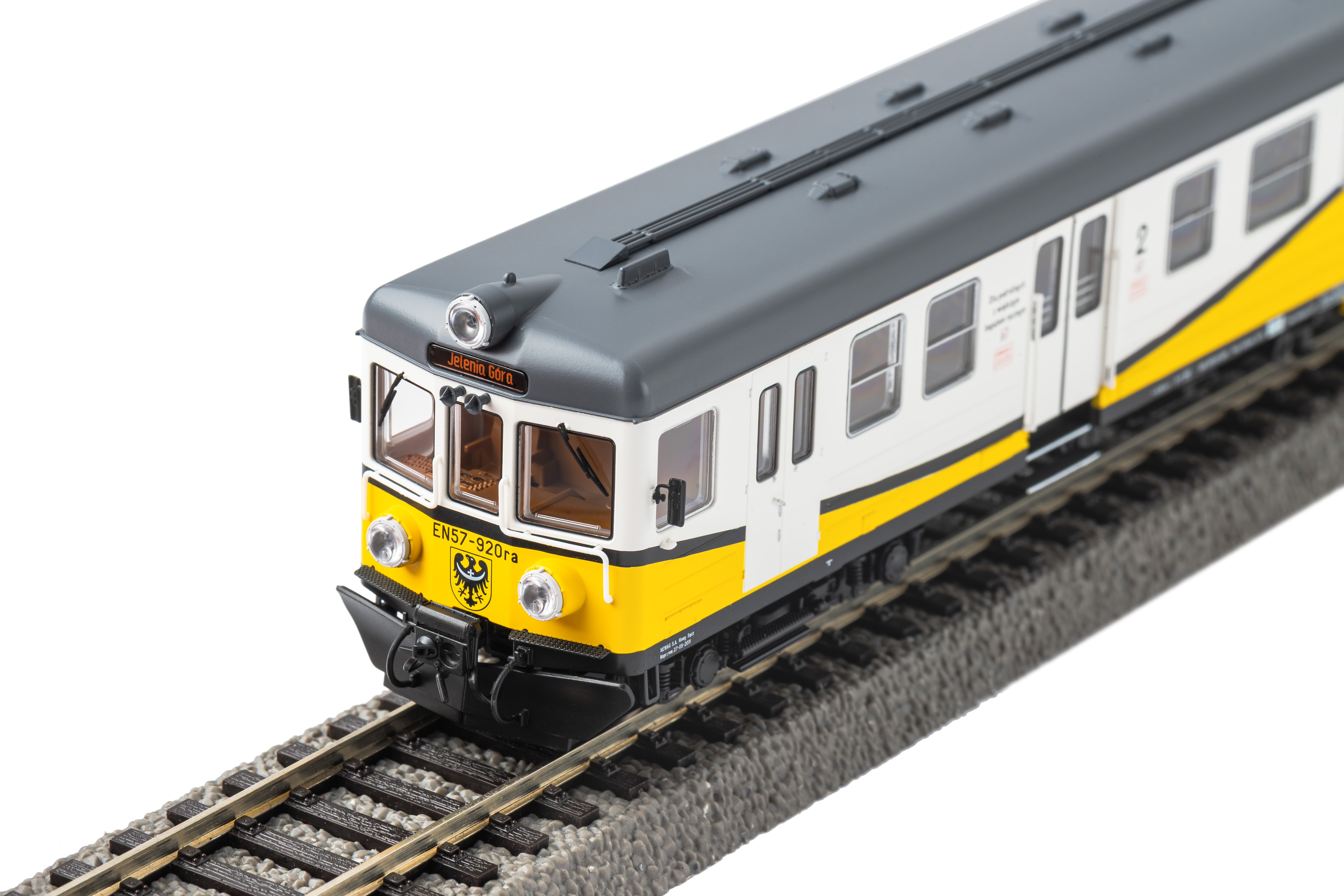 Neuheit 2025: Von 1961 bis 1993 wurde der elektrische Triebwagen der Baureihe EN57 für die Polnischen Staatsbahnen (PKP) gebaut. Das Einsatzgebiet des dreiteiligen Triebzuges war seit jeher der Nahverkehr. Anzutreffen ist er im Umland von Danzig, oder auf der S-Bahnstrecke Szybka Kolej Miejska w Trójmieście. Mittlerweile ist dieses Aufgabenfeld nicht mehr direkt der PKP unterstellt. Ein vollwertiger Zug besteht aus einer festen Zugkonfiguration von zwei Steuerwagen (Bezeichnung 5B) und einem Mittelwagen (Herstellerbezeichnung Typ 6A). Durch die Scharfenbergkupplung ist die Bildung von Doppeltraktionen oder noch längeren Zuggarnituren möglich.