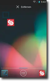 Über das Android-Hauptmenü können Sie die App weiterhin erreichen. Möchten Sie, dass die Verknüpfung wieder auf Ihrem Hintergrund erscheint, bzw. in der darunter liegenden „Schnellzugriffsleiste“, dann halten Sie das Symbol der gewünschten App im Hauptmenü ein paar Sekunden gedrückt, solange bis das Android automatisch auf den Hintergrund wechselt. Dort können Sie die App dann ablegen (wahlweise auch in der Schnellzugriffsleiste). Auf dieselbe Art können Sie auch Apps vom Android-Hintergrund entfernen. Halten Sie das Symbol / die Verknüpfung solange gedrückt, bis Sie es verschieben können. Dabei erscheint am oberen Bildschirmrand ein Schriftzug „Entfernen“. Schieben Sie Ihre Verknüpfung hierher und lassen Sie los, die Verknüpfung wird dadurch gelöscht. → (siehe Abschnitt 8.2)