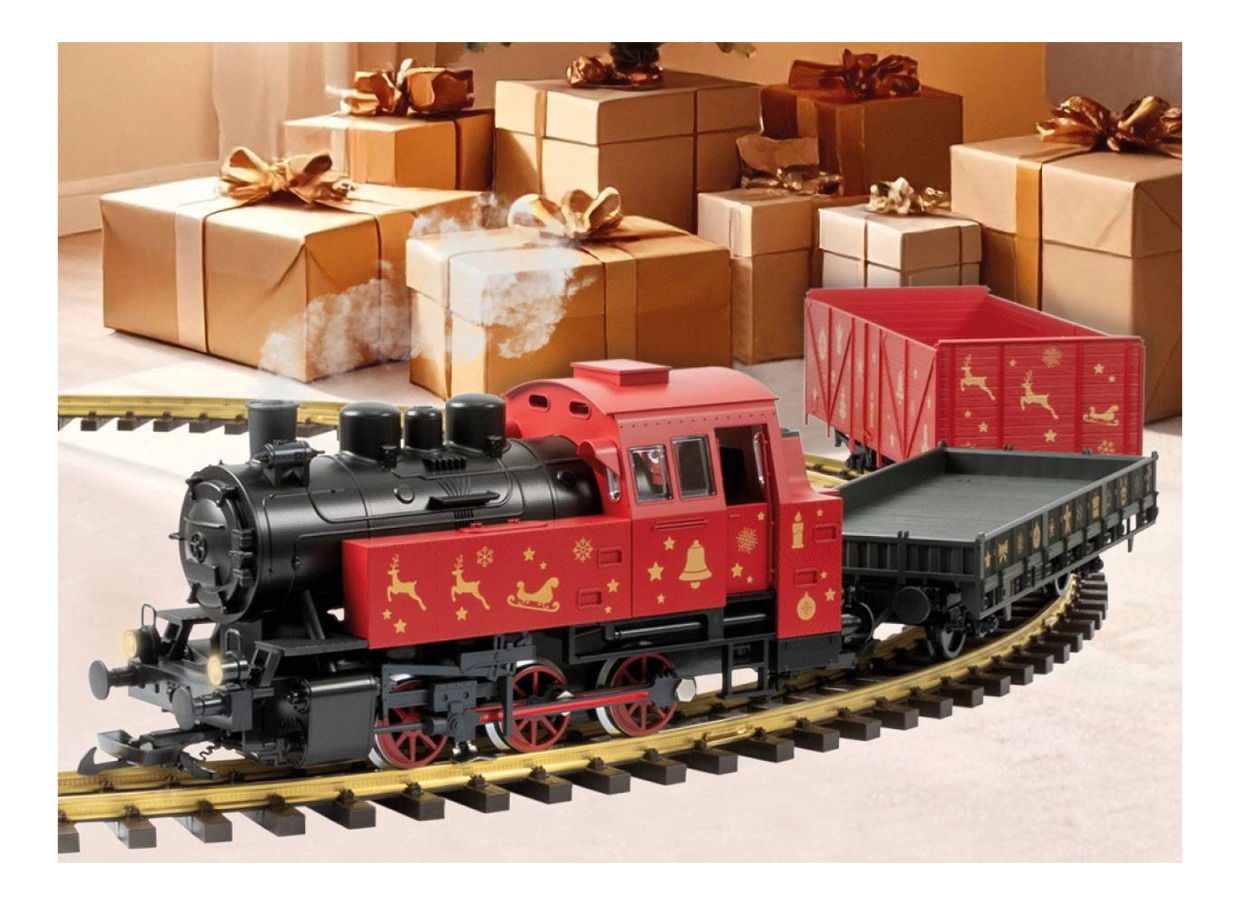 Der festliche Güterzug mit Dampflokomotive im typischen Weihnachtsdesign ist ein echter Hingucker unter dem Baum. Ideal für alle, die die Magie der Modelleisenbahn und die Stimmung der Feiertage lieben.