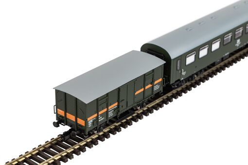 Novelty 2024: This car set consists of a DR type G02 boxcar and a type G02 boxcar painted and lettered for a DR permanent way train in Era IV. The models have TT close couplers.