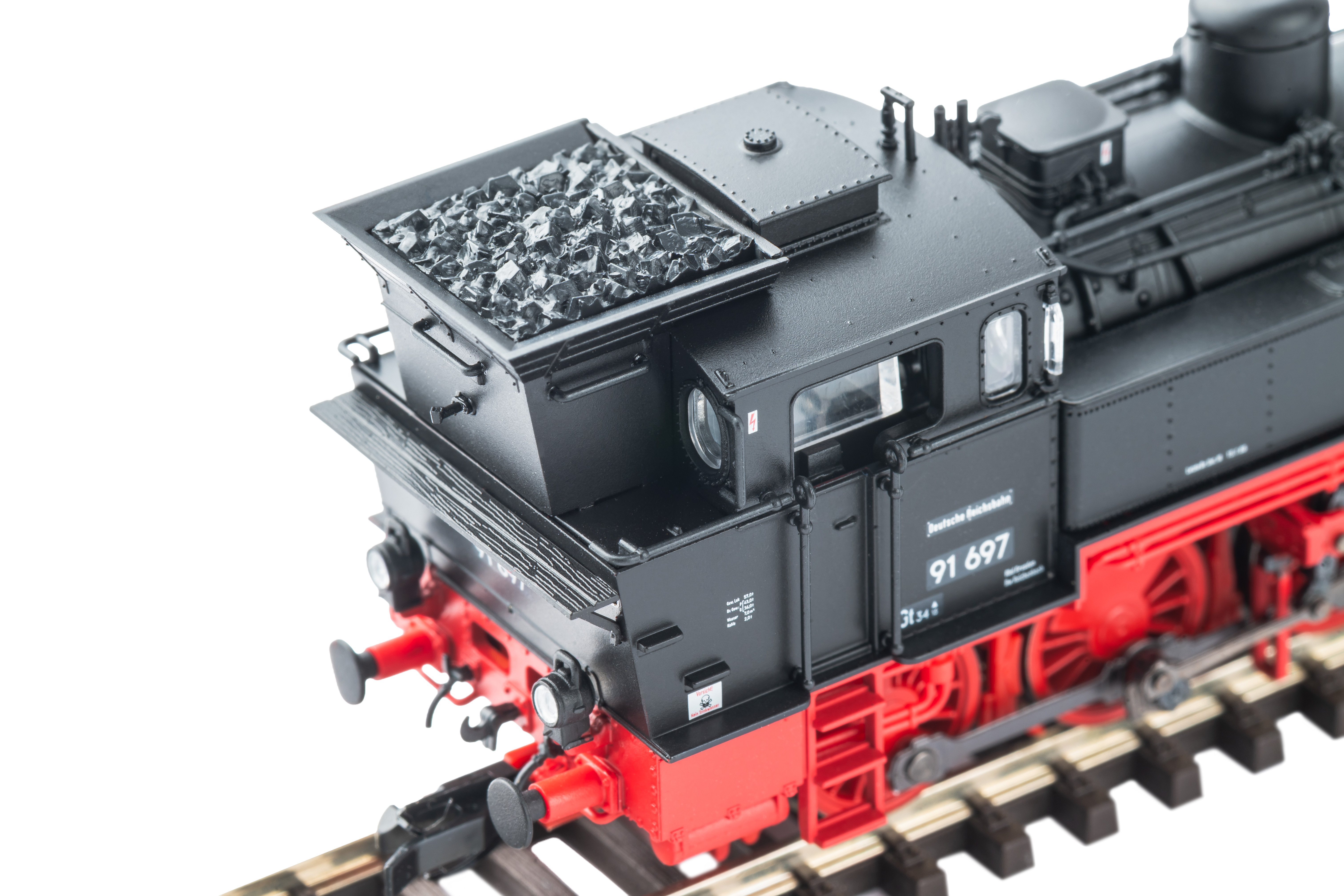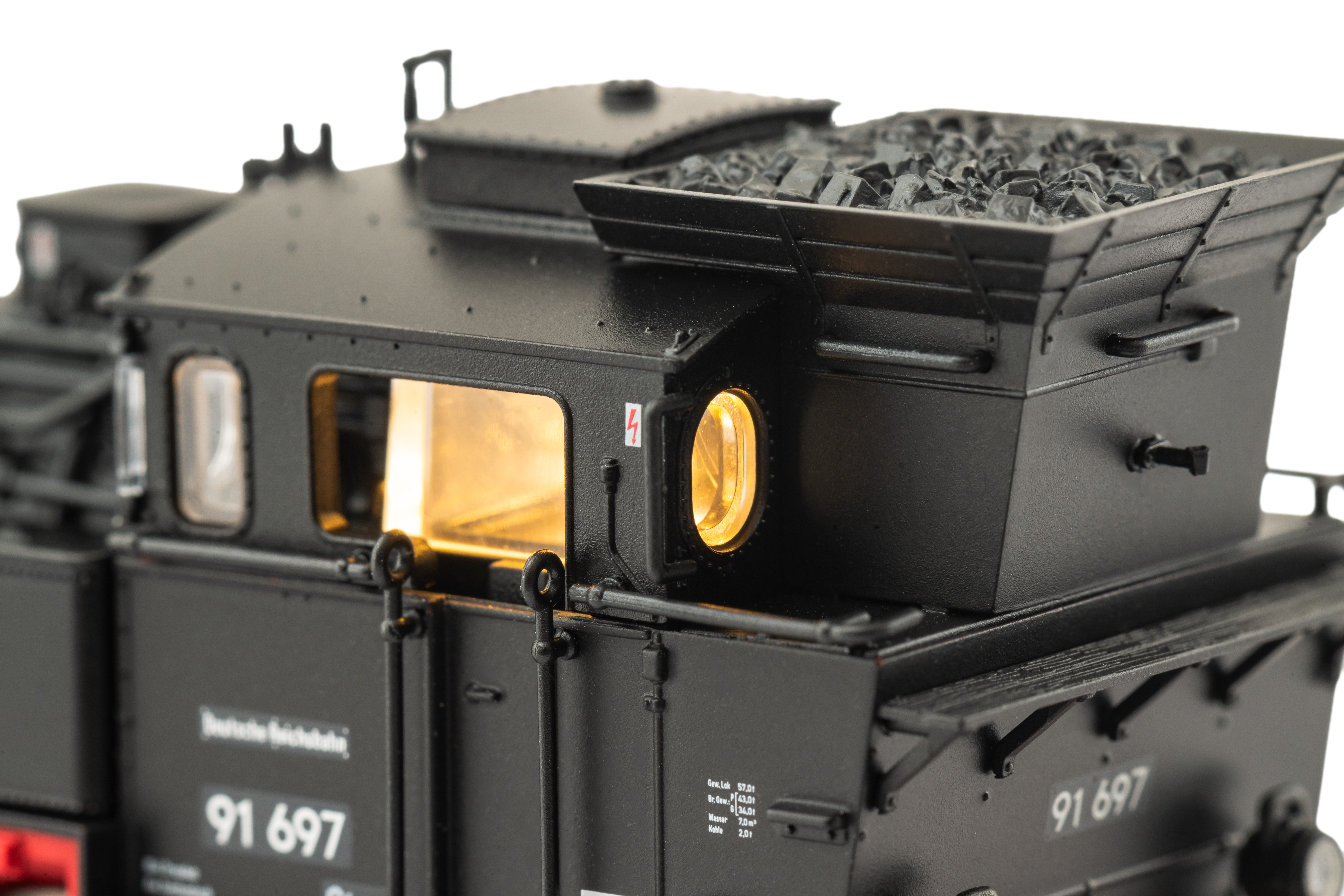 Version with DR cab and DRG lamps | Knorr-type air pump | With coal bunker extension, fine spoked wheels, and delicate valve gear | Separately applied handrails, whistle, bell, and smoke deflectors | Numerous separately applied pipes, handwheels, and sand pipes | In digital operation with switchable cab lighting | Brake hoses and coupling hooks included;