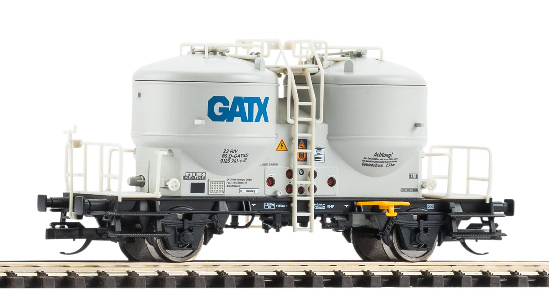 Cement silo car with GATX lettering in Era V | Suitable for TT scale | Prototypical fittings for filling and compressed air unloading | Accurately reproduced toggle locks on the silo containers | Very good rolling characteristics for safe operation on the layout | TT close couplings for prototypical coupling distances