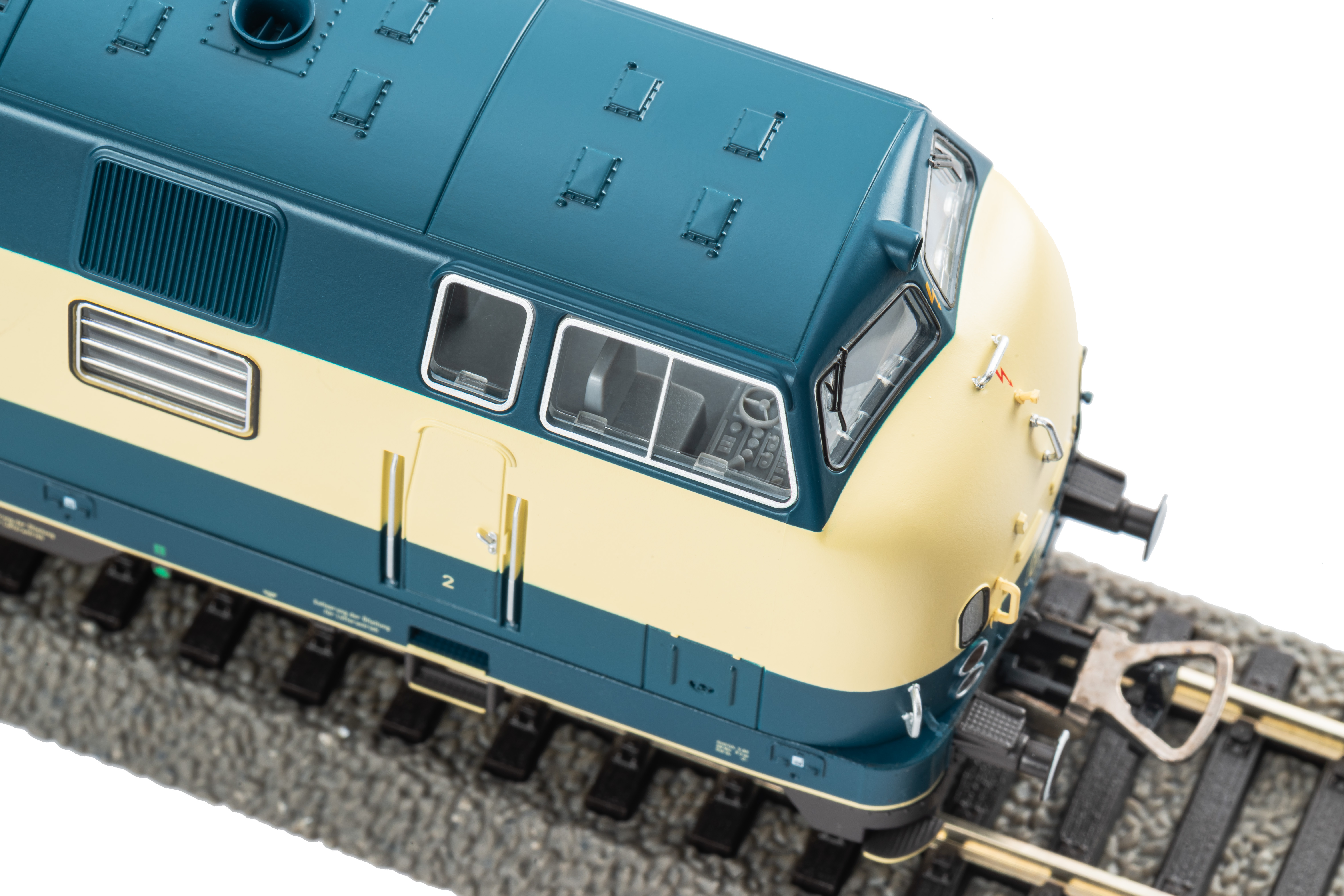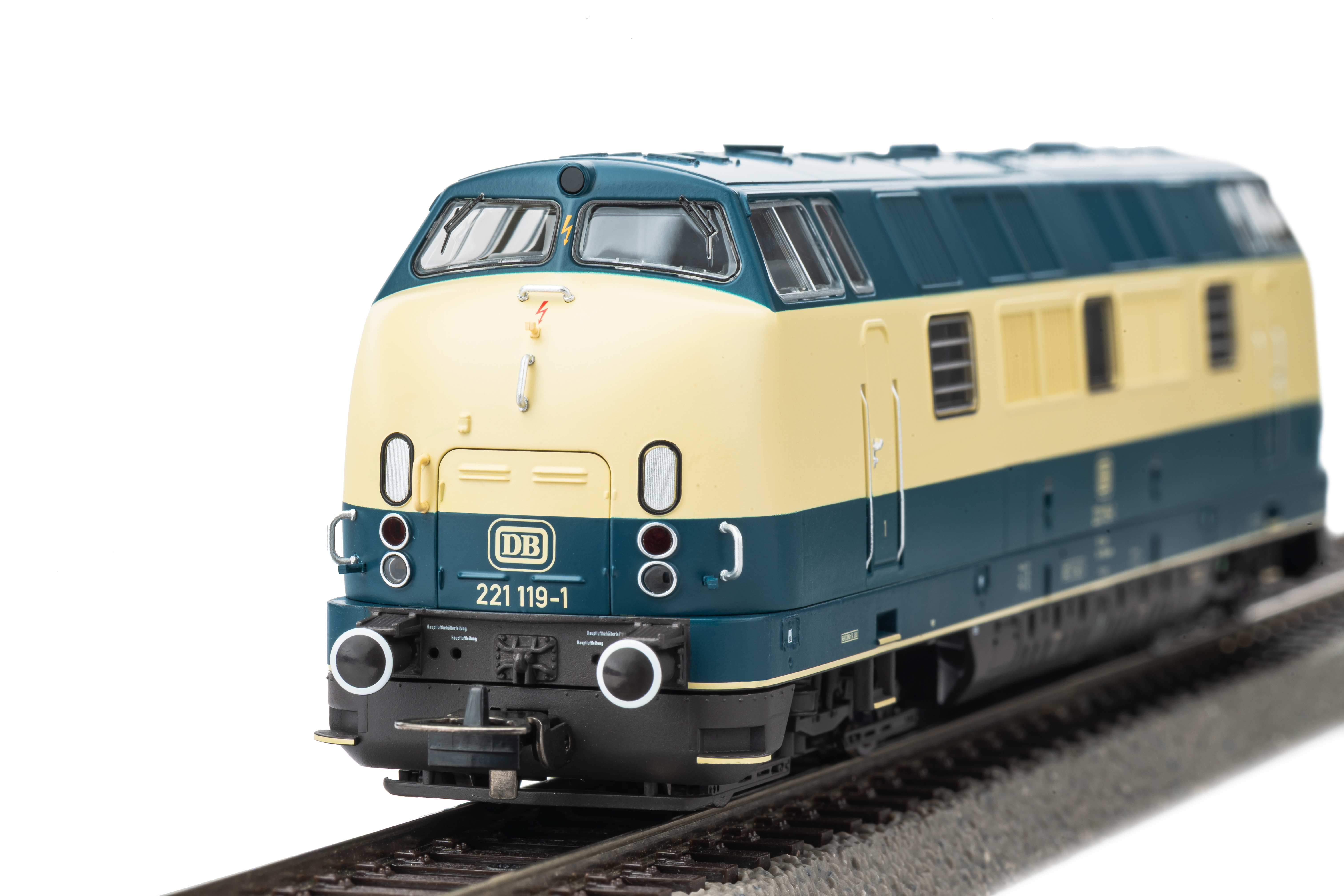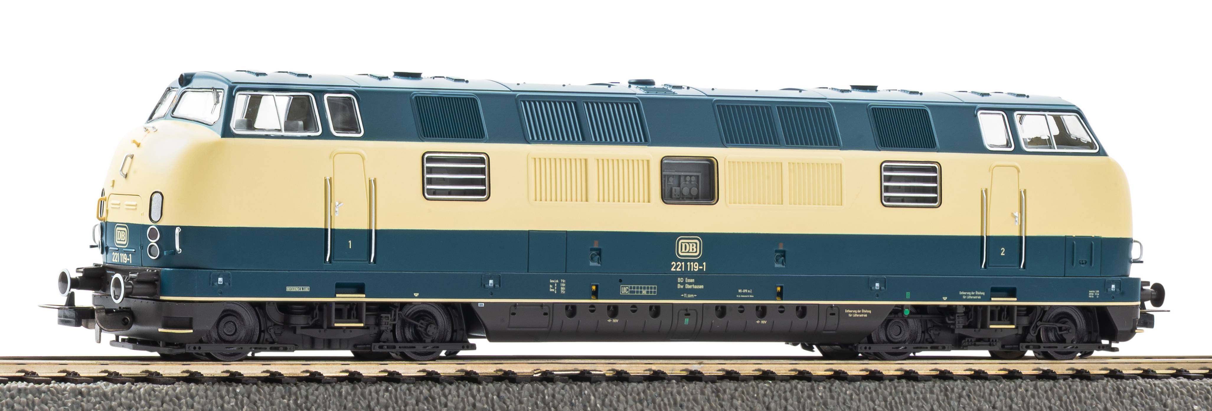 Novelty 2026: Design variant of the BR 221 without trim strips in blue-beige livery of the DB in Era IV. Technically, the model corresponds to the PIKO V200.1 #52600. The model comes factory-equipped with a PIKO XP sound decoder with matching speaker.