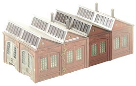 Two-storey locomotive shed with shed roof and attached workshop. Die beweglichen Tore können mittels der PIKO-Torschließ-Automatik, # 62002, durch die ein- und ausfahrende Lok geschlossen bzw. wieder geöffnet werden. Im Schuppen haben Loks bis zu einer Gesamtlänge von 65 cm Platz. Der gealterte und wetterfeste Schuppen kann mit weiteren Bausätzen beliebig in Länge und Breite vergrößert werden.
